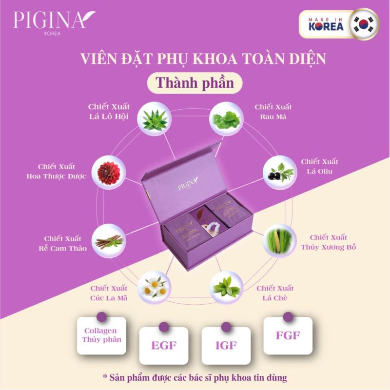 Hộp 6 Viên đặt phụ khoa PIGINA là liệu trình trải nghiệm để chăm sóc và hỗ trợ điều trị dứt điểm các vấn đề của vùng chữ Y. Đảm bảo sức khỏe và sắc đẹp vùng chữ Y của bạn thông qua công nghệ Nano phân tử, Collagen Thủy Phân, tái tạo tế bào 3-GF và chiết xuất 10 loại thảo dược thiên nhiên. Giúp phòng chống các vấn đề vùng kín như khí hư, mùi hôi, viêm, nấm tái phát dai dẳng trên nguyên lý tái thiết và duy trì độ pH cân bằng lí tưởng cho âm đạo ở mức 3.8-4.5. Đồng thời viên đặt PIGINA còn giúp trẻ hóa, cấp ẩm, tăng độ dày, tăng săn chắc cho niêm mạc âm đạo, tăng tiết nhờn tự nhiên ở âm đạo, giúp cải thiện sinh lý nữ.
