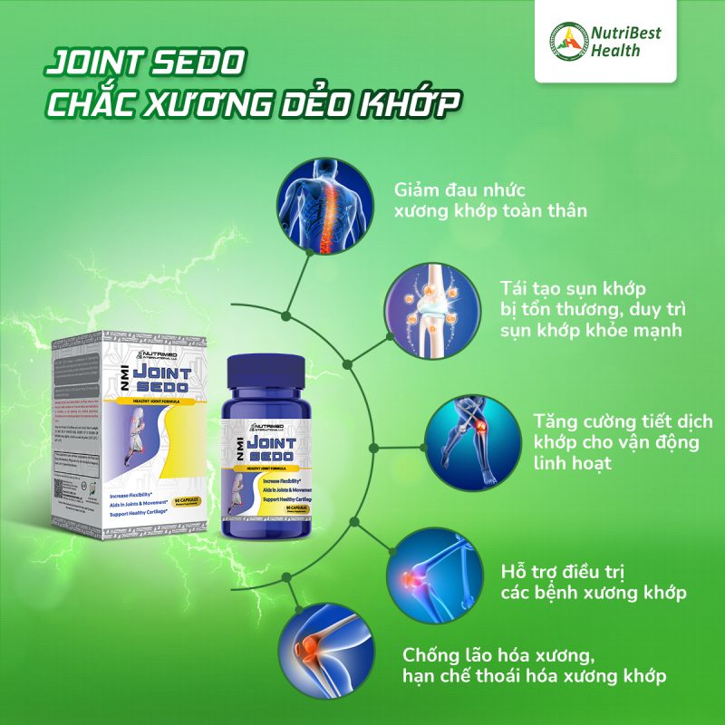NMI Joint Sedo là sản phẩm chất lượng theo tiêu chuẩn Mỹ của NUTRIMED INTERNATIONAL LLC được Nutribest Health làm đại diện thương mại phân phối tại Việt Nam, cam kết mang đến cho người sử dụng một sự kết hợp hoàn hảo giữa các chất dinh dưỡng bổ sung cho khớp chắc khỏe như glucosamin, calci, collagen type II và một hỗn hợp đặc biệt các dược liệu từ cây Liễu trắng, gừng, nhũ hương Ấn Độ, nghệ, ớt chuông, tiêu cayenne,…. giúp đẩy mạnh hấp thu các chất dinh dưỡng cùng với tác dụng kháng viêm tự nhiên đẩy lùi cơn đau nhanh chóng, mang lại cảm giác dễ chịu sau vài ngày sử dụng. Ưu điểm nổi trội của NMI Joint Sedo là thành phần nguyên liệu hoàn toàn đến từ thiên nhiên nên tăng độ an toàn, giảm thiểu những phản ứng phụ không mong muốn. Việc sử dụng đều đặn NMI Joint Sedo giúp hạn chế thoái hóa khớp, ngăn chặn quá trình gây viêm, hỗ trợ tái tạo sụn khớp, tăng độ bền và sự dẻo dai cho khớp.