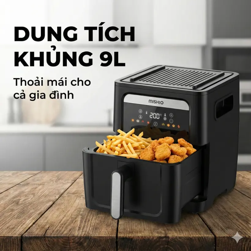 Nồi chiên không dầu đa năng Mishio MK407 dung tích 9L, công suất 1700W, thiết kế 2in1 vừa chiên vừa nướng, giúp chế biến đa dạng món ăn cho cả gia đình. Công nghệ chiên không dầu giảm tới 80% lượng mỡ thừa.