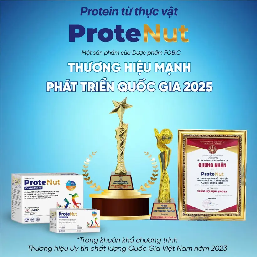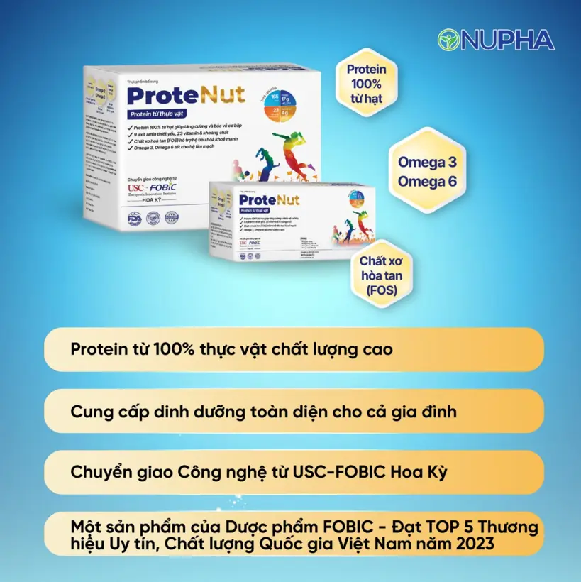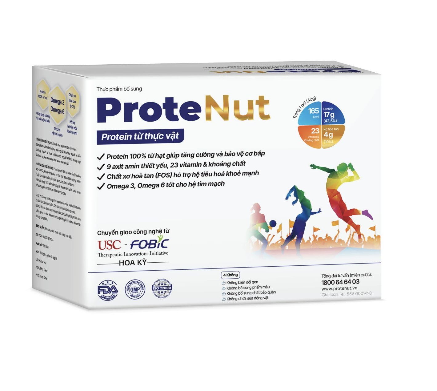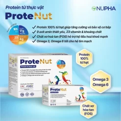ProteNut – Thực phẩm bổ sung protein từ thực vật, được tinh chế 100% từ thực vật, mang đến giải pháp dinh dưỡng toàn diện cho cả gia đình. Sản phẩm không chỉ cung cấp đạm thực vật chất lượng cao mà còn bổ sung 9 axit amin thiết yếu, 23 loại vitamin & khoáng chất, chất xơ hòa tan FOS, Omega-3 và Omega-6, Công thức toàn diện hỗ trợ tăng cường sức khỏe, cải thiện tiêu hóa, hỗ trợ tim mạch, phòng ngừa bệnh tật và an toàn cho cả người tiểu đường hoặc mỡ máu.
