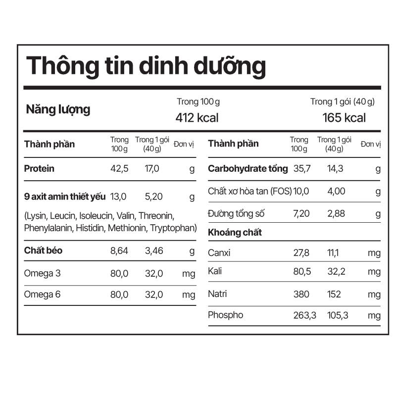 Đạm tinh chế từ: Đậu Hà Lan (Pea Protein 80%), Hạnh nhân (Almond Protein 54%), Đậu nành (Soy Protein 90%); Béo thực vật (Bột kem béo); Dầu hạt lanh (Flaxseed Oil); Dầu hướng dương (Sunflower Oil); Các loại bột (Yến mạch, Óc chó, Đậu đỏ); Chất xơ hòa tan (Fructo Oligosaccharide – FOS); Hỗn hợp Vitamin và Khoáng chất (Retinyl acetate (Vitamin A), Cholecalciferol (Vitamin D3), α-Tocopheryl acetate (Vitamin E), Phytonadion (Vitamin K1), Thiamin mononitrat (Vitamin B1), Riboflavin (Vitamin B2), Pyridoxin hydrochlorid (Vitamin B6), Cyanocobalamin (Vitamin B12), Natri ascorbat (Vitamin C), Nicotinamid (Vitamin B3), Axit folic (Vitamin B9), Canxi pantothenat (Vitamin B5), D-Biotin (Vitamin B7), Natri selenit, Đồng sulfat, Mangan sulfat, Kali iodid); Isomaltulose; Tastim mask (BEV); Chất chống đông vón (INS 551); Chất tạo ngọt tổng hợp (Sucralose); Hương liệu tổng hợp dùng trong thực phẩm (Hương vani).