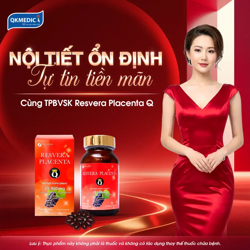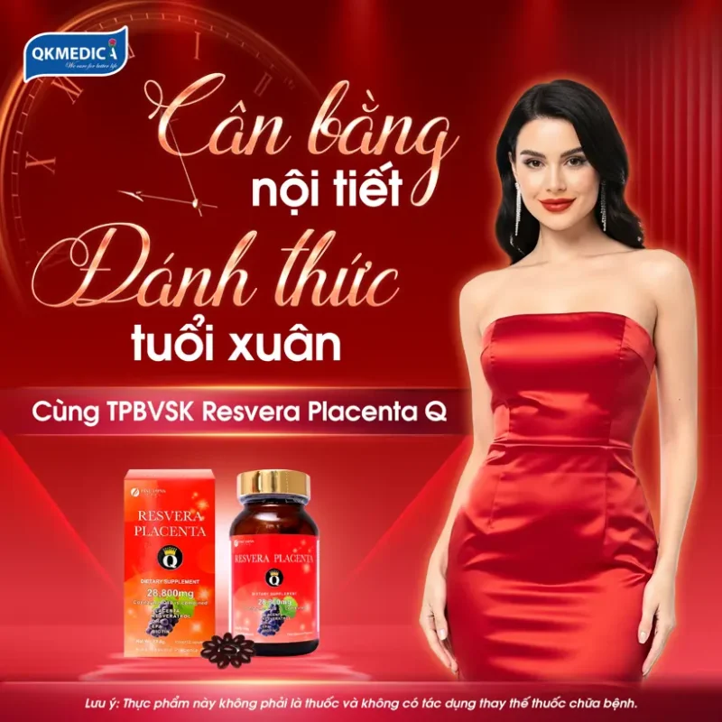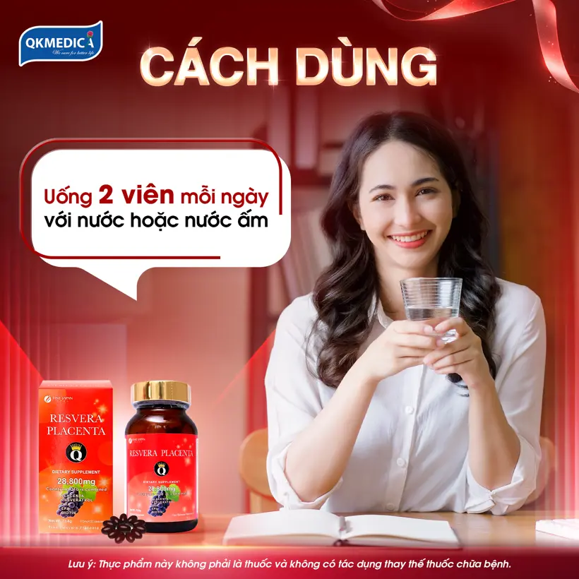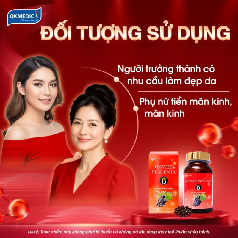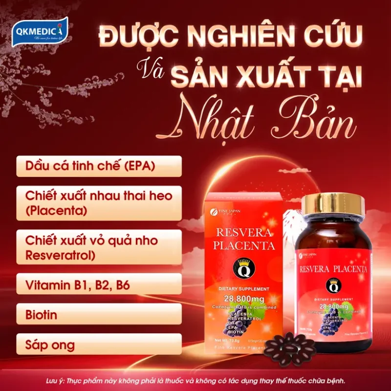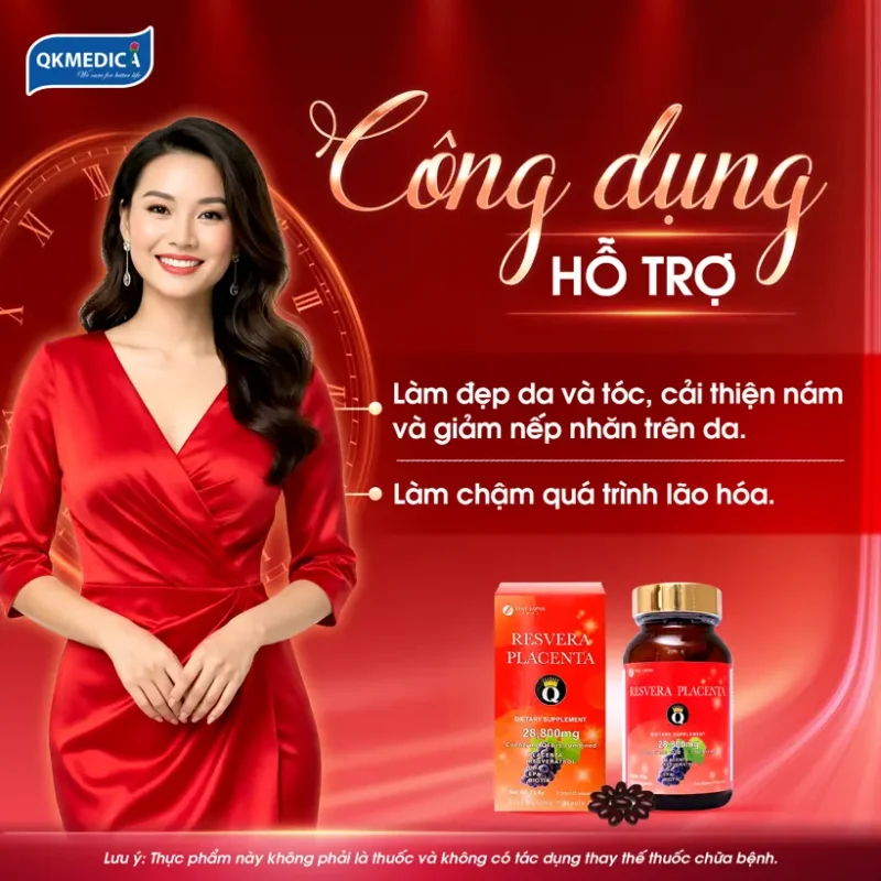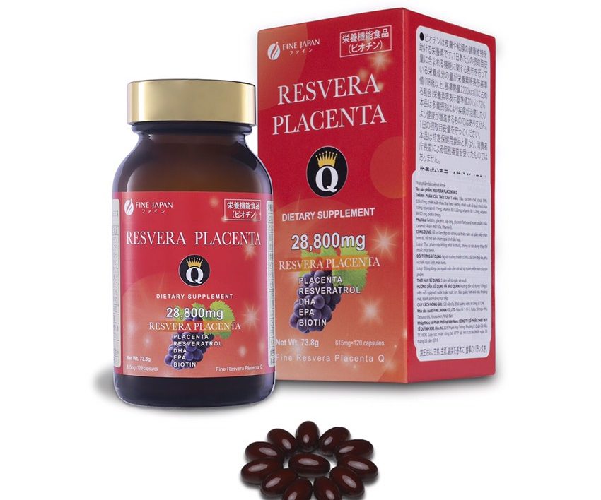 Resvera Placenta Q (hộp 120 viên), Hỗ trợ làm đẹp da và tóc, cải thiện nám và giảm nếp nhăn trên da; hỗ trợ làm chậm quá trình lão hóa.