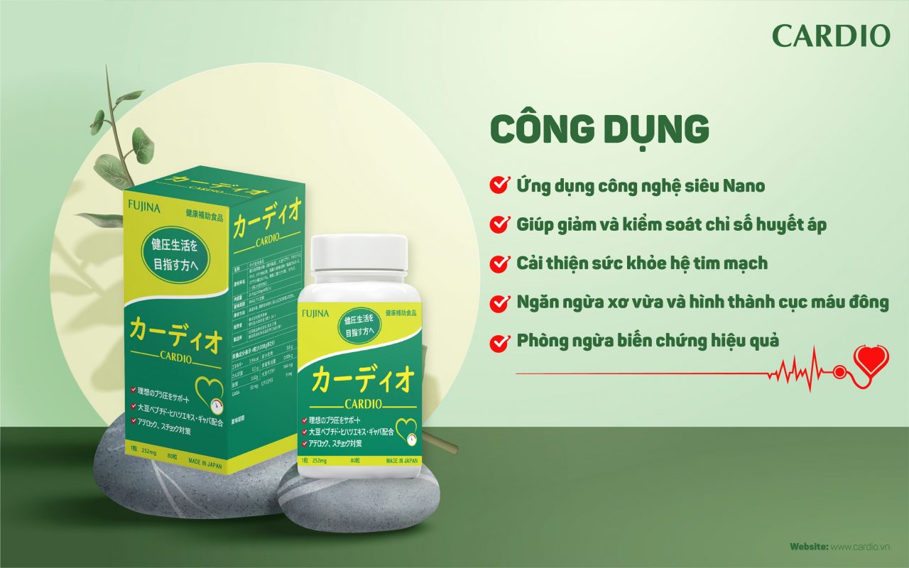 Ứng dụng công nghệ đột phá Nano Siêu Tới Hạn kết hợp dược liệu quý hiếm lâu đời đắt giá hàng đầu trong hỗ trợ điều huyết áp cao tại Nhật Bản là Đậu nành Nhật (chứa Peptide). Trải qua hơn 10.000 công trình nghiên cứu, vượt qua mọi tiêu chuẩn khắt khe nhất thế giới của Nhật Bản mới sản xuất thành công viên hạ huyết áp CARDIO. Sản xuất trực tiếp tại nhà máy chuẩn GMP thế giới của tập đoàn Sumioka Nhật Bản với hơn 50 năm kinh nghiệm sản xuất các sản phẩm chất lượng cao.