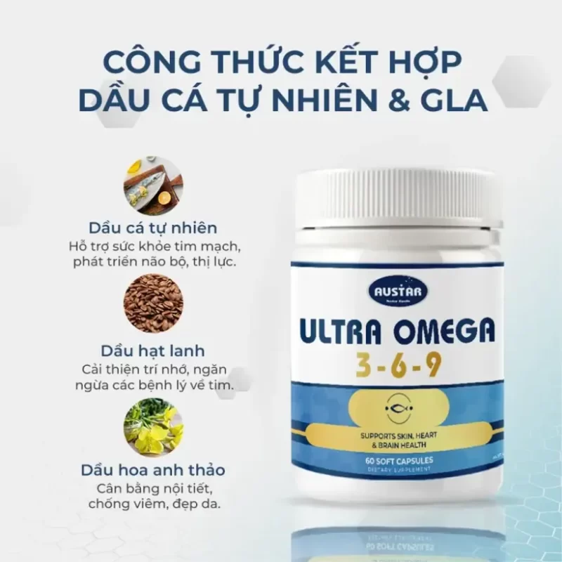Viên uống AUSTAR Ultra Omega 3-6-9 được chiết xuất từ các nguồn dầu tự nhiên như dầu cá, dầu hạt lanh và dầu hoa anh thảo, giúp bổ não, tăng cường sức khỏe tim mạch, và cải thiện làn da.