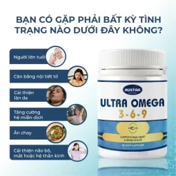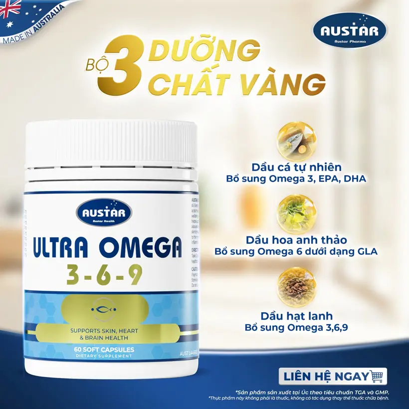 Viên uống AUSTAR Ultra Omega 3-6-9 là một sản phẩm bổ sung dinh dưỡng toàn diện, cung cấp ba loại axit béo thiết yếu là Omega-3, Omega-6, và Omega-9, có vai trò cực kỳ quan trọng đối với sức khỏe tổng thể.